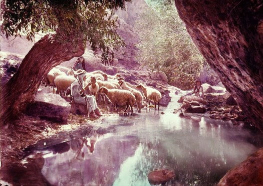 An old photographic slide of shepherd life taken in or around the Holy Land between about 1900-1920. It was one of a series illustrating Psalm 23.