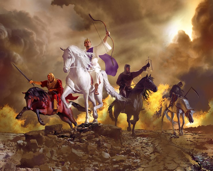 An artist’s depiction of the four horsemen who bring the judgments unleashed by the opening of the first four seals of the scroll (Revelation 5:1-8)―the ‘four horsemen of the apocalypse’.